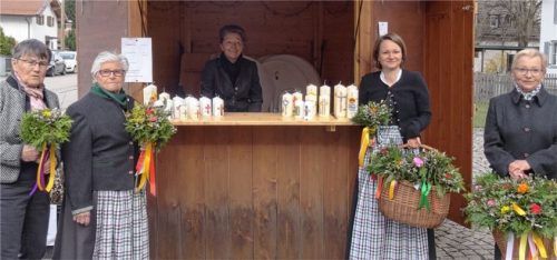 Viele fleißige Hände von der Katholischen Frauengemeinschaft (KFG) Raubling hatten 120 Palmbuschen und über 130 verzierte Osterkerzen angefertigt und am Palmsonntag vor der Pfarrkirchen Heilig Kreuz zum Verkauf angeboten. Über die Hälfte der Kerzen wurden bereits verkauft, der bisherige Erlös von üb