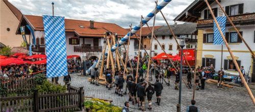 Ein neuer Maibaum steht in Törwang. Die zahlreichen Besucher ließen sich durch ein paar Schauer nicht aus der Feierlaune bringen, zu groß war die Freude über ein gemeinsames Dorffest. Der neue Baum ist 30 Meter lang. Nach dem Auszählen der Jahresringe wurde sein Alter auf genau 100 Jahre bestimmt. D