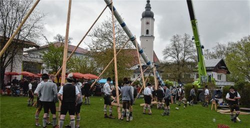 Mit ganz viel Muskelkraft und genauso wie es der Tradition entspricht, brachten die Mitglieder der Pruttinger Vereinen und des Schwaberinger Trachtenvereins den bemalten Maibaum in die Senkrechte. Der Kran, der zur Sicherheit in der Nähe stand, wurde nicht benötigt. Schon bald stand der 28 Meter hoh