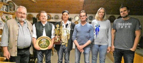 Knapp drei Dutzend Schützen beteiligten sich kürzlich am End- und Königsschießen der Altschützengesellschaft Großkarolinenfeld im Sportheim. Dabei wurde um die besten Teiler und Ringe geschossen. Zum anschließenden Foto der stolzen Sieger stellten sich (von links) Zweiter Schützenmeister Helmut Tris