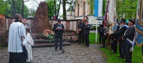 Die Schloßberger Ortsvereine hielten ihren Jahrtag ab. Nach dem Kirchenzug vom Feuerwehrhaus zur Kirche St. Georg und einem Gottesdienst trafen sich die Fahnenabordnungen am Kriegerdenkmal. Vorsitzender Werner Fritz vom Krieger- und Veteranenverein Schloßberg mahnte als Ausrichter des Jahrtages in s