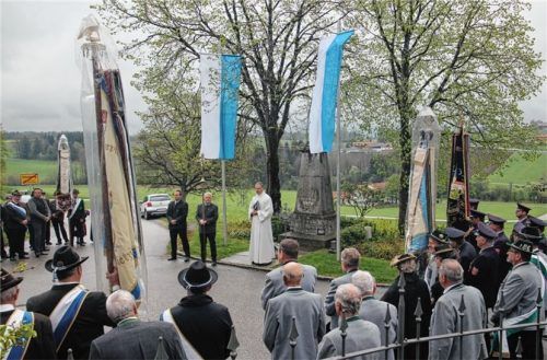 Gut besucht war der Veteranen- und Vereinsjahrtag in Schwabering. Das feierliche Gedenken am Kriegerdenkmal hielt Diakon Michael Leberle (unser Bild). Mit dabei war der Obmann der Interessengemeinschaft der Krieger-, Veteranenvereine und Soldatenkameradschaften im Landkreis, Pius Graf. Im Anschluss