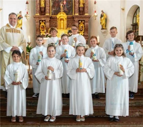 Mit den liebevoll gestalteten Kommunionkerzen zogen elf Kinder der Pfarrei Aschau (links) in die Pfarrkirche ein, begleitet vom Gesangs- und Instrumentalensemble unter Leitung von Gitti Herden. Pfarrer Janßen knüpfte in seiner Predigt beim Traum Jakobs mit der Himmelsleiter an und sprach mit den Kin
