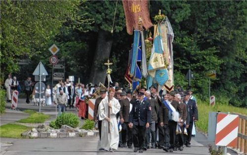 Nach der Eucharistiefeier der Stephanskirchner Pfarreien in der Pfarrkirche Maria Königin des Friedens in Haidholzen zogen die Gläubigen gemeinsam in einer Prozession zu den Außenaltären. Pfarrer Fabian Orsetti trug die goldene Monstranz mit dem Allerheiligsten. Foto Schlecker
