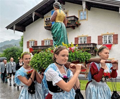 Betend und singend zog die Fronleichnamsprozession der Pfarrgemeinde von Aschau durch den blumen- und fahnengeschmückten Ortskern. Der Prozession ging der Festgottesdienst in der katholischen Aschauer Pfarrkirche „Darstellung des Herrn“ voraus. Die aktiven Dirndl der beiden örtlichen Trachtenvereine