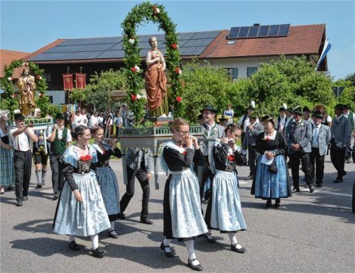 „Gott sei Dank dürfen wir das wieder feiern“, sagte Gemeinderatsmitglied Maria Furtner in Riedering. Fronleichnam ist ein Hochfest im Kirchenjahr und erinnert an den Gründonnerstag und die Einsetzung der Eucharistie. Da die Karwoche keinen Prunk erlaubt, wurde das Fest Fronleichnam auf den Donnersta