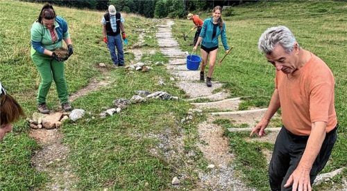 Auf dem Weg von der Doaglalm zum Hochriesgipfel waren heuer ehrenamtliche Helfer der Sektion Rosenheim des Deutschen Alpenvereins (DAV) unterwegs, um Schäden zu beseitigen. Unter der fachkundigen Anleitung von Wast Fehr (rechts) und Wegereferent Robert Brenninger (hinten, links) wurden Wasserausleit