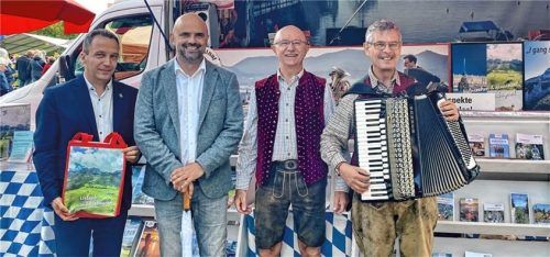 Erneut war Wolfgang Bude aus Aschau (Dritter von links) mit dem Urlaubstruck im Spreewald zu Gast. Er machte für zwei Tage beim Spreewaldfest auf der Schlossinsel in Lübben Halt und warb für die Urlaubsregion rund um den Chiemsee. Nach seiner Rückkehr zeigte sich der schon pensionierte, aber rüstige
