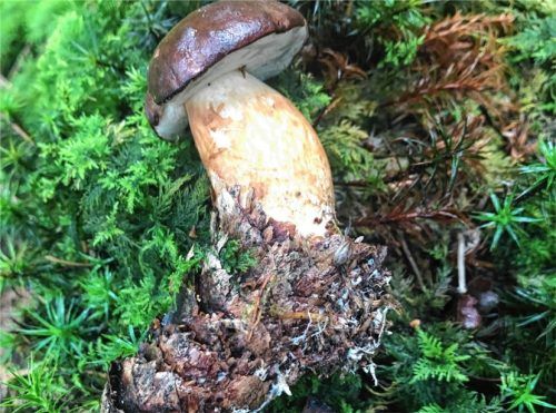 Ist das nicht eine lustige Laune der Natur? Leser-Reporter Dr. Gerhard Hillebrand aus Rohrdorf fand bei einem Spaziergang in der Nähe von Rohrdorf ein Maronenröhrling, der aus einem Fichtenzapfen wächst. Foto Hillebrand