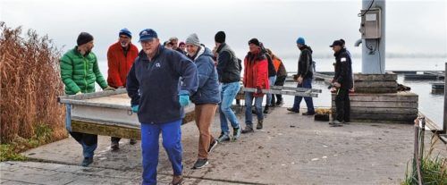 An die 60 Mitglieder des Segler- und Ruderclubs Simssee kamen zum Arbeitseinsatz, um das Clubgelände winterfest zu machen. Viele Helfer sind auch nötig, denn die Schwimmstege mit den Holzrosten müssen aus dem Wasser geholt und an Land gelagert werden. Zudem wurden das Clubgelände und das Clubhaus vo