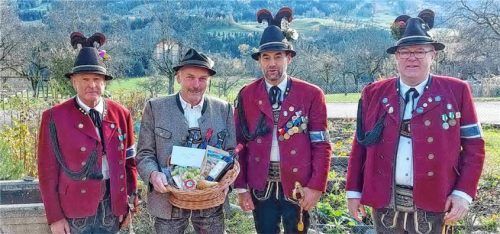 Die Gebirgsschützenkompanie Samerberg gratulierte ihrem Gründungsmitglied und langjährigen Fähnrich Michael Staber (Zweiter von links) zu seinem 70. Geburtstag. Seit 1996 verwahrt und trägt Staber die Fahne. Auf dem Foto freuen sich bei der Geschenkübergabe (von links) Hauptmann Fritz Dräxl, Michael