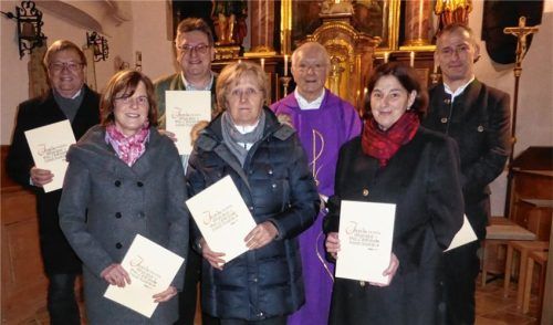 Nach dem Gottesdienst zum vierten Advent ehrte die Singgemeinschaft langjährige Mitglieder des Kirchenchors von St. Georg Großholzhausen. Kirchenpfleger Alfred Repšys überreichte den Geehrten Urkunden und kleine Präsente. An der Ehrung nahmen (hinten, von links) Markus Kracher, Stephan Heinke, Pfarr