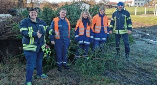 Drei Teams der Freiwilligen Feuerwehr Eggstätt sammelten – mit Unterstützung der Jugendfeuerwehr – Christbäume ein. Corinna Unger (von links), Alois Birner, Sophia Fritz, Kilian Janson und Benji Riedl packten fleißig mit an.Foto Hering