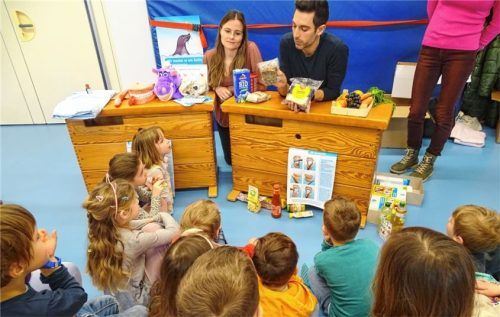 „Und immer schön von Rot nach Weiß putzen“ erklärte Dentdino, aus der Familie der lila Zahndinosaurier, den Kindern im Aschauer Kindergarten „Spatzennest“. Er war zusammen mit Zahnarzt Dr. Tobias Stiebler und zwei Zahnarzthelferinnen gekommen. Der Turnraum verwandelte sich in eine Zahnarztpraxis und