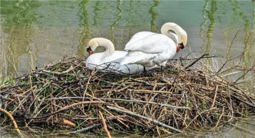 Weder von Starkregen noch von drohendem Hochwasser lässt sich in Kiefersfelden dieses Schwanenpärchen beeinflussen, das im Mündungsbereich des Kieferbachs in den Inn brütet. Während das Männchen die Brutstätte und die Umgebung beobachtet, widmet sich das Weibchen voll und ganz der Nest- und Eierpfle