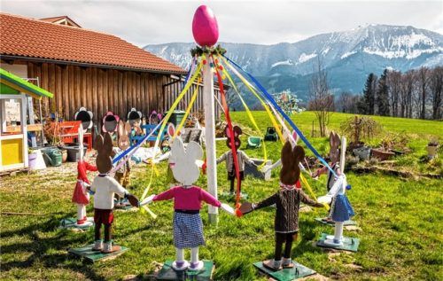 Im Garten von Edelgard Stuffer in Obereck auf dem Samerberg laufen die Vorbereitungen für eine neue österliche Szene: Dieses Mal ist es ein Tanz von Osterhasen in Tracht. Stuffer ist ob ihrer farbenfrohen Kunstwerke bekannt und geschätzt. Foto Nitzsche
