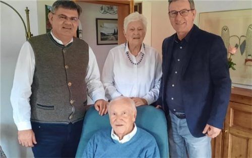 Richard Kalxdorff aus Egernbach feierte seinen 90. Geburtstag. Seit mehr als 30 Jahren wohnt er mit seiner Frau Gisela (Mitte) in Egernbach auf dem Samerberg. Die Glückwünsche zum Ehrentag von „Dick“ Kalxdorff überbrachten Samerbergs Bürgermeister Georg Huber (rechts) und Diakon Günter Schmitzberger