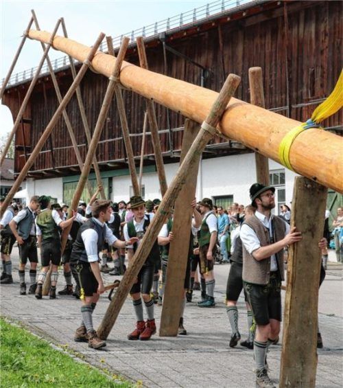 67 Männer der drei Trachtenvereine von Prien, Atzing und Wildenwart stellten den fast drei Tonnen schweren, 28 Meter langen Maibaum vor der Wildenwarter Schlosswirtschaft auf. Erstmals in der Wildenwarter Maibaumgeschichte wurde der neue Maibaum unmittelbar nach dem Fällen in der Deutenau von den be
