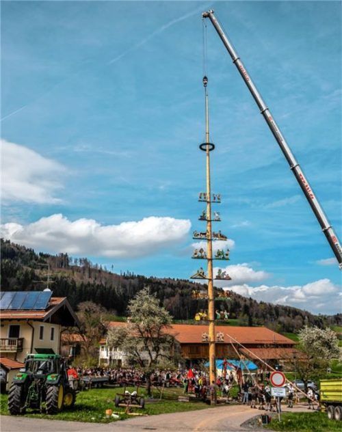 Seit Jahrzehnten wird in Roßholzen vom Trachtenverein „Almenrausch“ der Maibaum traditionell mit Händen und Stangen gestemmt. In diesem Jahr war dies aufgrund der sehr starken Regenfälle der vergangenen Wochen nicht möglich. Das Erdreich war zu nass und rutschte nach. Das machte ein Aufstellen mit M