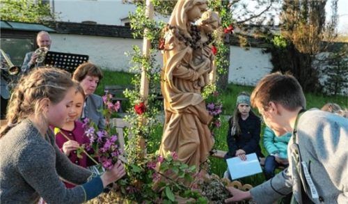 Eine Familien-Maiandacht im Freien feierten die Stephanskirchner Trachtler. Bei den Gebeten ging es um Familien mit all ihren Freuden und Sorgen. So lasen Eltern, Kinder und Großeltern Texte und Fürbitten. Die Trachtenkinder schmückten die Marienfigur mit frischen Blumen. Foto re