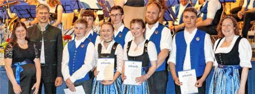 Ihr zehnjähriges Bestehen feierte die Schlossmusik von Schonstett (wir berichteten) mit einem gut besuchten Jubiläumskonzert in der Turnhalle der Grundschule. Der Musikbund Ober- und Niederbayern, Bezirk Inn-Chiemgau, nutzte diese Gelegenheit, um für besondere Leistungen und treue Aktivität Auszeich