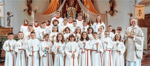 23 Mädchen und Buben feierten in der Kirche Hl. Kreuz, begleitet von der Musikkapelle Kiefersfelden, ihre Erstkommunion. „Gott hat uns sein Herz geschenkt – wie können wir es weiterschenken?“, lautete die Frage von Pfarrer Hans Huber an die Kinder und Erwachsenen. Der Kinderchor „Pusteblume“ und das
