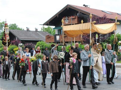 Bedingt durch die Zugehörigkeit zum Pfarrverband Neubeuern Nußdorf fand die traditionelle Fronleichnamsprozession in Nußdorf erst am Sonntag statt. Mit Böllerschüssen wurden um 6Uhr die Gläubigen geweckt. Nach einem Gottesdienst, den Pfarrer Christoph Rudolph zelebrierte, wurde in einer festlichen P