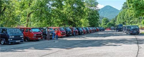 Rund 50 limitierte VW-Busse mit dem Baujahr 1992 treffen sich in Brannenburg an der Wendelsteinbahn