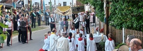 Zu ungewohnter Abendstunde fand in der Pfarrgemeinde St. Vitus Hochstätt unter großer Teilnahme der Pfarrgemeinde, mit Ortsvereinen und ihren Fahnenabordnungen, der Priester im Zentrum unter dem „Himmel“, die Fronleichnamsprozession statt. Musikalisch begleitet von der Hochstätter Musi und dem Kirch