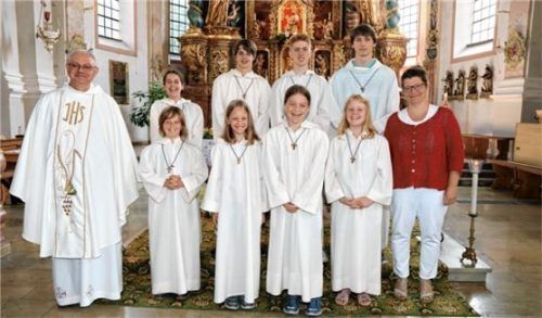 Pater Paul nahm vier neue Ministranten feierlich in ihren Dienst für die Pfarrgemeinde Halfing auf. Nach intensiver Vorbereitung wurden sie in der Pfarrkirche Mariä Himmelfahrt willkommen geheißen. Die neuen Ministranten (vorne von links) Lukas Rieger, Josefine Haslauer, Katharina Guggenberger und A