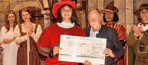 Tief beeindruckt zeigte sich Dieter Jurgeit, Vorsitzender des Fördervereins, von der gelungenen Premiere des Ritterschauspieles Kiefersfelden. Allein die 69 Bühnenbildwechsel bei den drei Akten von „Mangolf von Rottenburg“ begeisterten ihn und das Publikum. Jurgeit war es eine Ehre, dem Ensemble ein