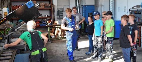 Einen Einblick ins Schmiedehandwerk erhielten drei Mädchen und sechs Buben beim Söchtenauer Ferienprogramm. Dominik Berghamer (Mitte) von der Firma „B + M Metallbau“ in Salmering zeigte den Kindern mit zwei Helfern, wie Schmiedekunst geht. Eingeladen hatte der Schnupfclub Söchtenau. Unter fachmännis