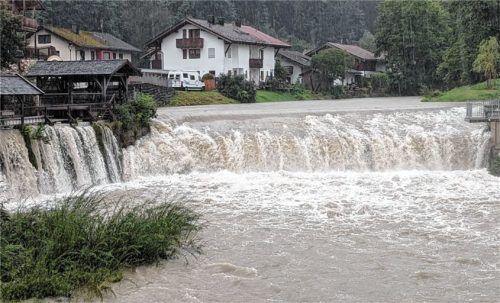 Blickt man auf den mitten durch Kiefersfelden fließenden Kieferbach, schlägt das Herz gleich etwas schneller. Der Fluss ist durch die starken Regenfälle massiv angeschwollen. Auch wenn es jetzt Entwarnung gibt, waren es zwei spannende Tage für die Anwohner.Foto Hoffmann