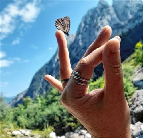 Unser Leser-Reporter Claus Nickolmann aus Vogtareuth war mit seiner Partnerin auf der Griesener Alm unterwegs, als sich ein Falter auf dem Finger seiner Partnerin niedersetzte. Mit dem Wilden Kaiser im Hintergrund gelang ihm dieser Schnappschuss.Foto Nickolmann