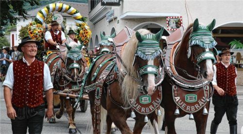 Zur Eröffnung des Aschauer Marktes zogen die örtlichen Vereine, angeführt von der Musikkapelle, in einem Festzug vom Hans-Clarin-Platz zum Festzelt an der Schützenstraße. Die Wirtsfamilie Heinrichsberger und die Festzeltbedienungen, die Vertreter der Auer-Brauerei und das Auerbräu-Prunkgespann zogen