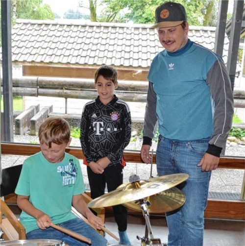 Einen Vormittag mit Blasmusik gab es im Ferienprogramm der Gemeinde Prutting. Simon Ladner (rechts), Leiter der Jugendkapelle und Bläserklasse beim Musik- und Gesangsverein Prutting, und seine Helfer führten acht Buben und Mädchen in die Welt der Musik ein. Da dröhnte es in mehreren Räumen des Pfarr