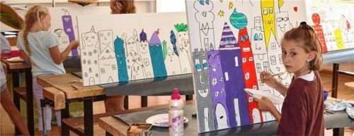 Acht Kinder, alles Mädchen, kamen im Rahmen des Riederinger Ferienprogramms in die Annette-Thoma-Grundschule. Unter der Leitung von Saskia Niederberger stand Malen mit Acrylfarben auf dem Programm. Die Kinder kreierten Bilder, bei denen die Werke von James Rizzi als Vorbild dienten. Die farbenfrohen