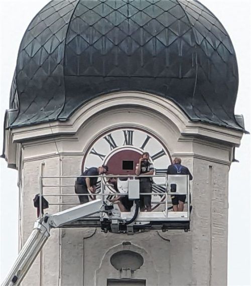 In luftiger Höhe sind aktuell Reparaturarbeiten an der Kirchturmuhr der Pfarrkirche Heilig Kreuz in Raubling im Gange. Rund 65 Meter hoch ist der Kirchturm, an dem die Uhren angebracht sind. Neben entsprechendem Fachwissen ist auch Schwindelfreiheit angesagt.Foto Hoffmann