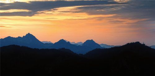 Ein prachtvolles Farbenspiel wie auf einem Gemälde aus der Romnatik bot sich über diesem Alpenpanorama. Der Blick von der Scheibenwand nahe Aschau in Richtung Westen zeigt links den Wendelstein und rechts daneben die Hochries.Foto Niederbuchner