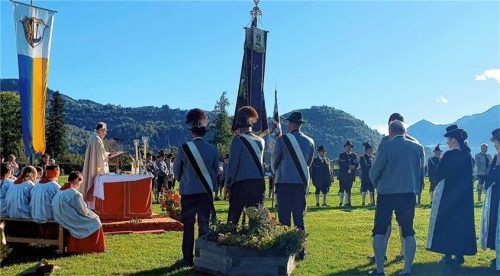 Insgesamt 117 Pferde und rund 20 Pferdegespanne beteiligten sich am Samstag am Leonhardiritt in Niederaudorf. Am Keindl-Anger wurde die Festmesse mit Pfarrer Hans Huber gefeiert (links). Musikalisch umrahmt wurde die Messe von der Musikkapelle Niederaudorf. Nach der Messe erfolgte der dreimalige Umr