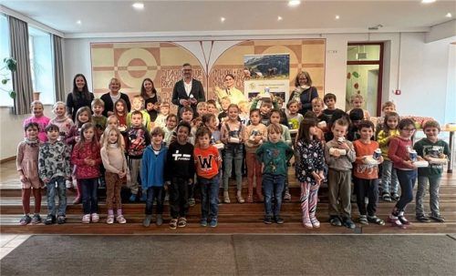 In Aschau fand an der Preysing Grundschule eine Bio-Brotzeitbox-Aktion für die Erstklässler statt. Neben der Vertreterin der Gemeinde Aschau, Elisabeth Linhuber, Fachbereichsleiterin für Jugend und Kindergarten, und den Managerinnen der Öko-Modellregion (ÖMR), Stefanie Adeili und Stephanie Wimmer, w