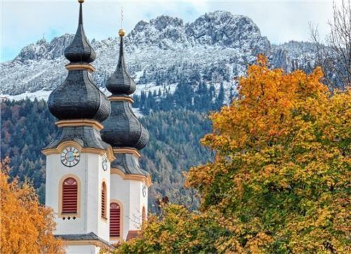 Am Wochenende hat der erste Schnee Einzug in den Bergen gehalten. Ein farbenfrohes Bild entstand hier in Aschau. Die Aufnahme zeigt die doppeltürmige katholische Pfarrkirche „Darstellung des Herrn“. Im Hintergrund prangt der angezuckerte Aschauer Hausberg, die Kampenwand. Foto H. Reiter