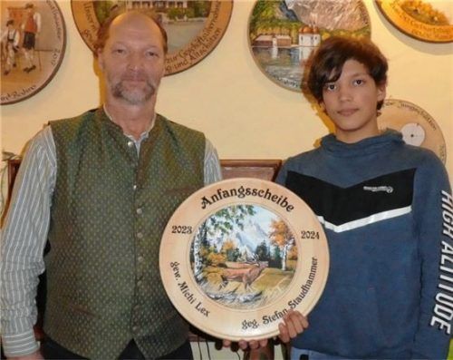 Beim Anfangsschießen der Moosschützen spendete Stefan Staudhammer (rechts) als glücklicher Gewinner der letztjährigen Endscheibe die Scheibe. Schützenmeister Michael Lex (links) gelang der beste Treffer. Er nahm die um seinen Namen ergänzte Scheibe in Empfang.Foto Hering
