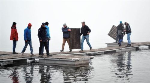Weit über 60 Mitglieder des Segler- und Ruderclubs Simssee kamen zum alljährlichen Arbeitseinsatz zum SRS-Clubgelände am Simssee. Viele Helfer sind nötig, denn die Schwimmstege mit den Holzrosten müssen aus dem Wasser geholt und über den Winter an Land gelagert werden. Daneben wurden Club-Gelände un