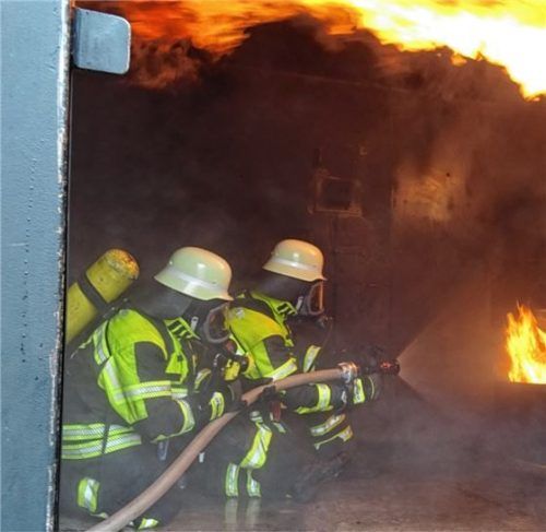 Feuerwehrleute des Landkreises Rosenheim trainierten zusammen mit zwei Ausbildern die Grundlagen des Atemschutzeinsatzes in Oberaudorf. Hierbei begaben sich 132 Atemschutzgeräteträger in eine Brandcontaineranlage. Das sichere Ausziehen der Schutzanzüge bildete den Abschluss der Übung. Der Kreisbrand