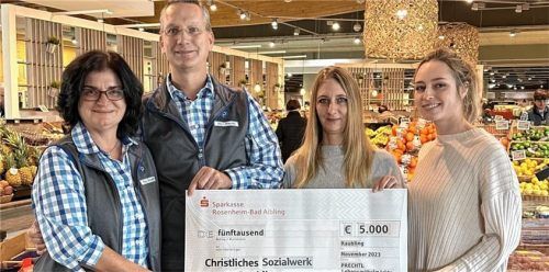 Eine großzügige Spende von den Prechtl Lebensmittelmärkten mit dem Wunsch, dass diese direkt den Mitarbeitern des Christlichen Sozialwerks Raubling zugute kommen soll, durften Pflegedienstleiterin Marianne Gerg (Dritte von links) und kaufmännische Leiterin Laura Leitner (rechts) entgegennehmen. Mit