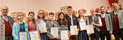 „Wir nutzen die Bühne unserer Cäcilienkonzerte, um den Musikantennachwuchs für bestandene Prüfungen zu ehren“, freute sich Werner Schroller, Vorsitzender der Musikkapelle Kiefersfelden. Stolz präsentierten sich die jungen Leute, die für guten Erfolg Urkunden erhielten, beim Gruppenfoto. Der Bezirksv