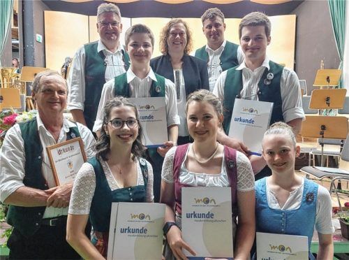 Ein Frühjahrskonzert der „Hoizhauser Musi“ ohne Ehrungen ist nur schwer vorstellbar. Im Rahmen des Konzerts zeichnete Michaela Haindl vom Musikbund Ober- und Niederbayern ein langjähriges Mitglied und jene, die Leistungsabzeichen erworben haben, aus. Mit den Worten „Eine herausragende Leistung“ wurd
