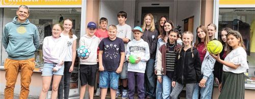 Helmut Enzinger (links) vom Weltladen Brannenburg gratuliert der Dientzenhofer-Realschule zur Teilnahme am „Fairtrade Bälle-Quiz“. Die Schüler der siebten Klasse hatten alle Fragen des bayernweiten Quiz richtig beantwortet. Dafür überreichte der Weltladen Brannenburg nun in Pakistan fair produzierte