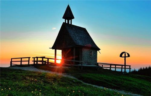 Blick auf die Kapelle bei der Steinlingalm unterhalb der Kampenwand im Gegenlicht bei untergehender Sonne. Die Kapelle wurde zu Ehren von Josef Hell dem Erbauer des
